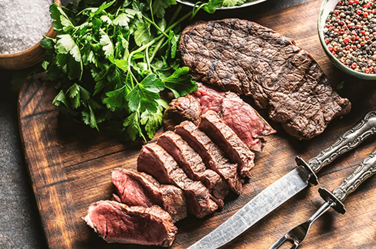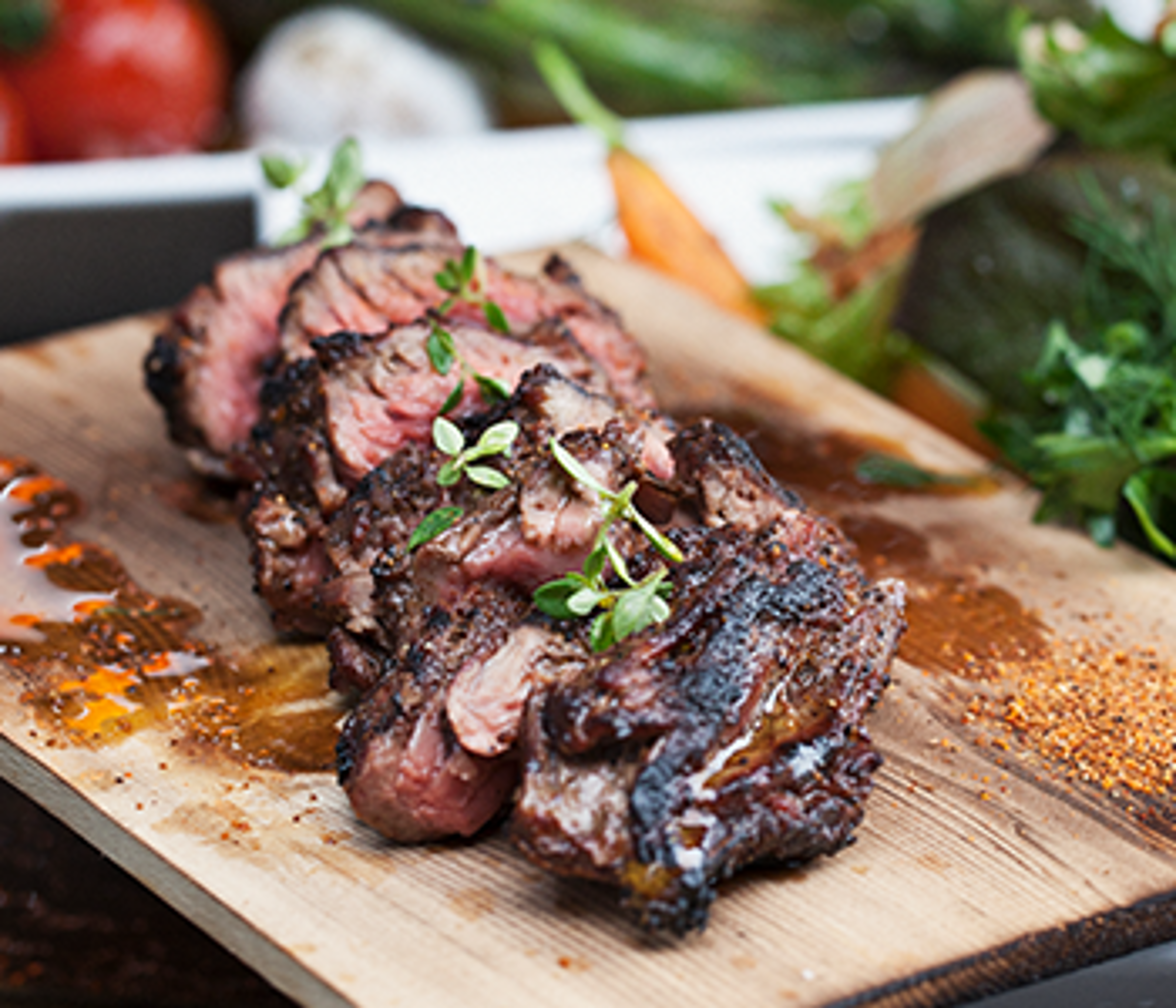 Vänd skivan när köttsaften börjar sippra ut på ovansidan. Ta upp köttet när det nått rätt innertemperatur. En digitaltermometer är därför väldigt bra att ha till hands. När är köttet färdigt? Den gamla bondepraktikan ger följande tips: När köttet känns som kinden är det blodigt. När köttet känns som nästippen är det medium. När köttet känns som pannan är det genomstekt.