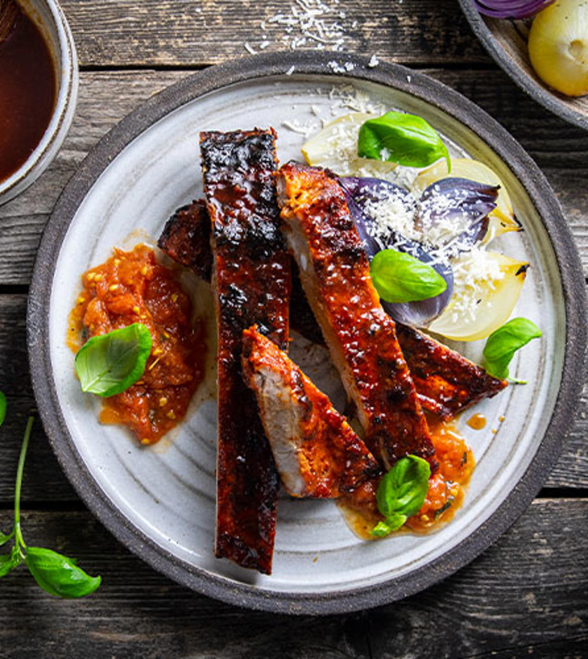 Långbakad skinkstek med senap, äpple, rotsaker och timjan