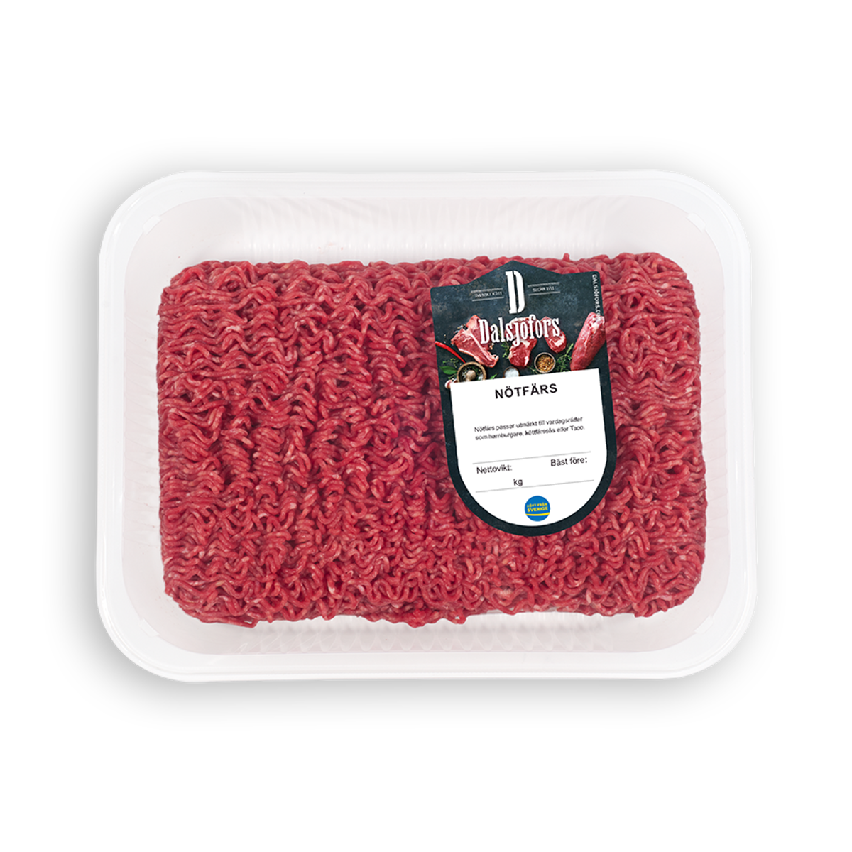 Ingredienser: Färs av nöt (85%)*, vatten, potatisstärkelse, potatisflingor, salt, lök, svartpeppar, rökarom. *Ursprung Sverige