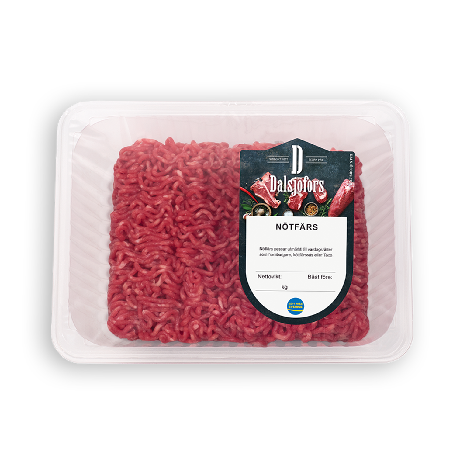 K-pack x 500 gDalsjöfors nötfärs är en råvara med mycket smak som går att variera i det oändliga, utmärkt till vardagsrätter som hamburgare, köttfärssås eller tacos. Middagstips, One Pot pasta med tacokryddad köttfärs, paprika, lök och tomat, serverad med tacosås, riven ost och en klick crème fraiche. Snabbt, enkelt och passar hela familjen. Dalsjöfors, alltid med kött från utvalda svenska gårdar.
